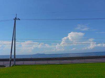 背の低い建物と田んぼと穏やかな海と。